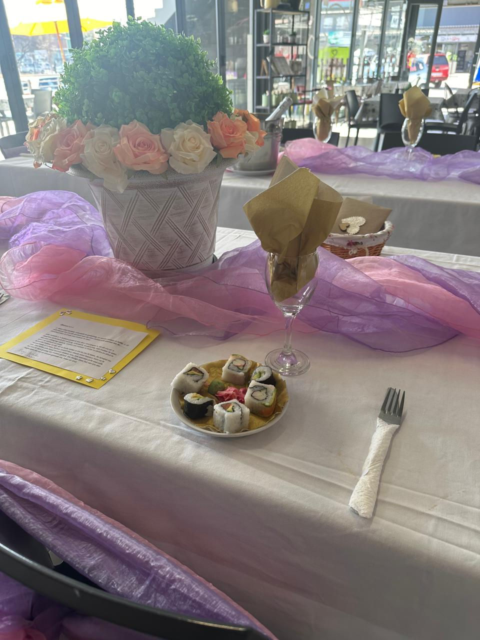 Die mooi gedekte tafels was net ‘n druppel in die emmer van wat die oggend alles sou oplewer. Tannie Petro Zaayman, ‘n familievriendin, het die dag vir hulle gereël saam met die bestuurder van EveryDay Diner, Hyla Alberts. Dit was ‘n hele span poging en Hyla en haar span het die versierings gratis geleen by Lifestyle Centre en die heerlike sjokolade troukoek is gemaak deur ‘n vriendin van tannie Petro, Salomie Gericke. Tannie Petro het ook as die seremoniemeester gedien en ‘n seën oor die egpaar uitgespreek voordat hul die tafelgebed gedoen het.
