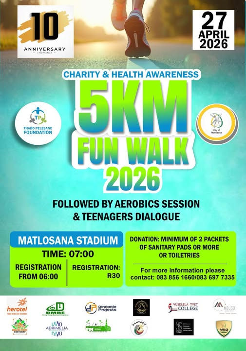 5KM Fun Walk (27 April 2026): Partnering with the Thabo Pelesane Foundation, the municipality will host a charity walk at Matlosana Stadium. Entry requires a R30 registration fee and a donation of toiletries or sanitary pads. The morning includes aerobics and a dialogue session for teenagers.