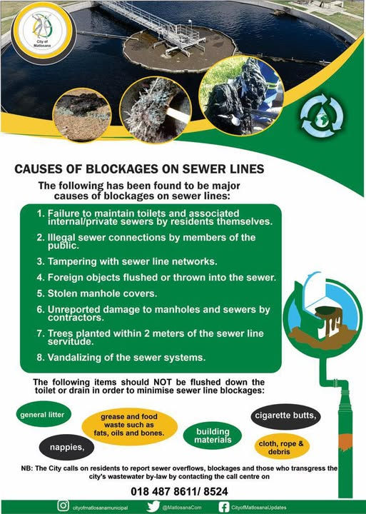 Sewer Line Integrity: A public awareness campaign has been launched to identify the leading causes of sewer blockages. The municipality cites illegal connections, vandalism, and the disposal of foreign objects (such as fats, building materials, and nappies) as primary factors in system failures. Residents are reminded to report overflows to the municipal call center at 018 487 8611/8524.