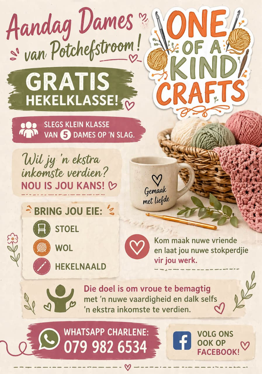 Die inisiatief genaamd "One of a Kind Crafts" bied gratis hekelklasse aan vir vroue in die area. Dit is nie net 'n plek om te leer hoe om 'n kettingsteek te maak nie. Die doel is ook om vroue bymekaar te bring sodat hulle nuwe vriende kan maak en bietjie uit die huis kan kom. Dit is 'n rustige manier om 'n nuwe vaardigheid aan te leer.