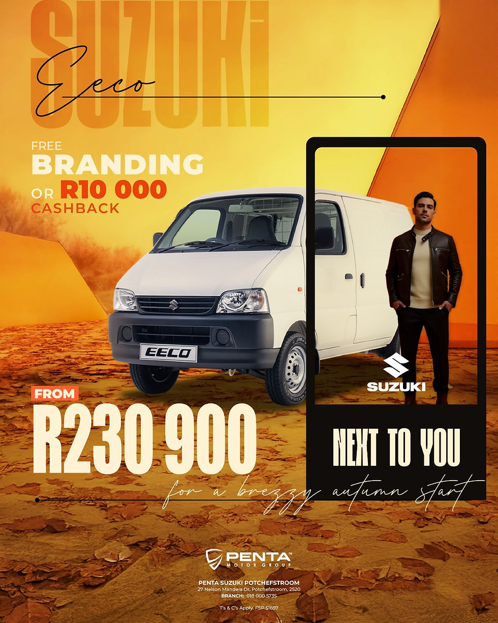 We haven't forgotten about the entrepreneurs and fleet owners who keep Potchefstroom moving. The Suzuki Eeco Panel Van is ready to get to work starting from R230 900. To help your brand stand out on the road, we are offering free branding on your new van or R10,000 cashback to help boost your bottom line. It is the perfect partner for any small business looking for reliability and low running costs this autumn.